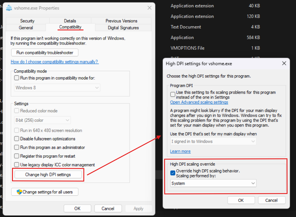 - A new pop-window will appear, tick the box Override high DPI scaling behaviour and chose Scaling performed by: System.